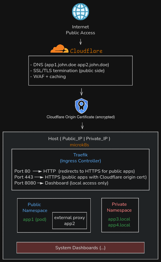This guide walks through setting up a complete MicroK8s cluster on Ubuntu with Traefik as the ingress controller. The architecture supports two types of applications: public apps exposed to the internet via Cloudflare DNS and TLS, and private apps accessible only from the local network. We’ll deploy containerized workloads running inside Kubernetes pods, proxy traffic to external hosts, and set up monitoring dashboards—all managed through declarative YAML manifests.